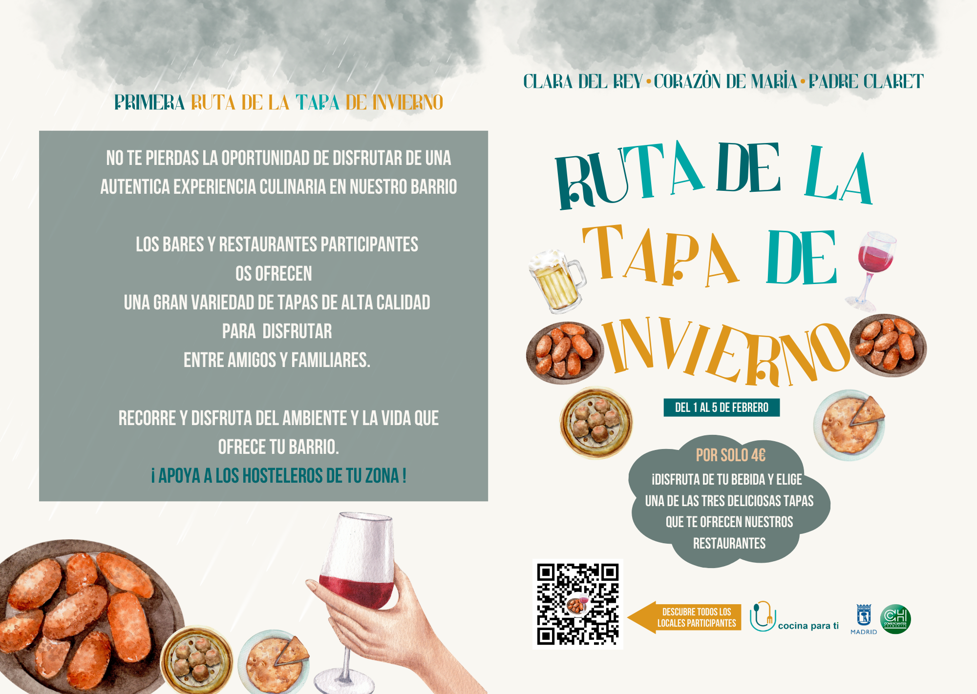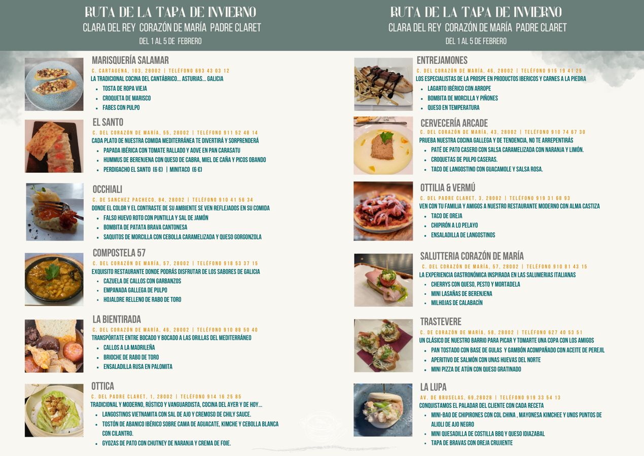 ¡La Tapa de Invierno de Corazón de María ha comenzado! Doce restaurantes del barrio de Prosperidad situados en el eje Corazón de María-Clara del Rey-Padre Claret, en la parte sur del distrito de Chamartín, participan del 1 al 5 de febrero en la I Ruta de la Tapa de Invierno, organizada por Cocina para Ti y que cuenta con la colaboración de la Asociación de Comerciantes de Chamartín y del Ayuntamiento de Madrid.
