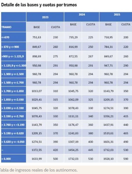 El texto legal del nuevo sistema de cotización por ingresos reales ya incluía las tablas con las bases que establecen las cuotas que pagarán los autónomos en 2025. Antes de su confirmación definitiva en los Presupuestos Generales del Estado, serán las siguientes: