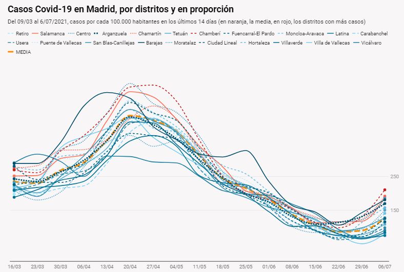 La quinta ola del coronavirus está de camino en Madrid. Todos los distritos de la ciudad ven aumentar esta semana sus casos y en algunas zonas la transmisión se está acelerando, según los datos del último boletín publicado por la Consejería de Sanidad. Los contagios se están multiplicando en las franjas de edades más jóvenes, las que tienen menos porcentaje de vacunación, en las que se dispara la incidencia muy por encima de la media. Los contagios se concentran principalmente…