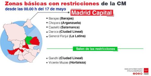 Chamartín seguirá sin zonas confinadas desde el 17 de mayo La Comunidad de Madrid levanta a partir del lunes 17 de mayo las restricciones de movilidad en tres zonas básicas de salud y no incorporará más áreas, por lo que esta medida seguirá en vigor en once zonas con una «alta incidencia de coronavirus», donde vive el 4 por ciento de la población madrileña. Se mantienen estas medidas a pesar de que, desde hace varios días, la incidencia acumulada de la región desciende de manera constante.…