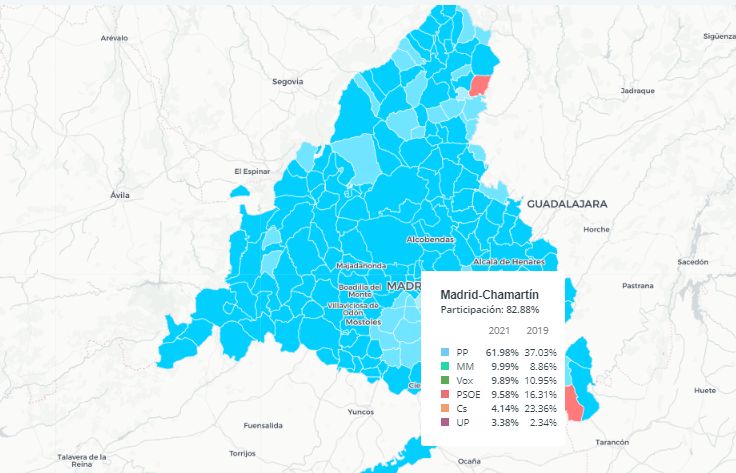 Seis de cada diez vecinos de Chamartín que acudieron a depositar su voto en las elecciones a la Comunidad de Madrid el pasado martes apoyaron al Partido Popular, que obtuvo en Chamartín un 61,98% de los votos emitidos. Aproximadamente uno de cada diez apoyó a Más Madrid (9,99%), uno de cada diez a Vox (9,89%) y uno de cada diez al PSOE (9,58%). En quinto lugar en el distrito aparece Ciudadanos, que contó en Chamartín con un 4,14% de los…
