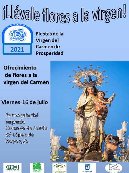 Vecinos y comerciantes homenajearán el próximo viernes 16 de julio a la Virgen del Carmen, patrona del barrio de Prosperidad, en la ceremonia religiosa que tendrá lugar a las 20.15 horas en la parroquia del Sagrado Corazón de Jesús (calle López de Hoyos 73). Un año más, todos los que lo deseen pueden llevar flores en homenaje a la Virgen a partir de las 19 horas o bien encargarlas desde hoy en cualquiera de las floristerías del barrio ya que éstas se encargarán de trasladarlas a la parroquia antes de la misa.